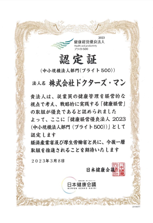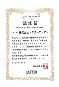 弊社は経済産業省と日本健康会議が地域の健康課題に即した取組や日本健康会議が進める健康増進の取組をもとに、特に優良な健康経営を実践している大企業や中小企業等の法人を顕彰する「健康経営優良法人 2023(中小規模法人部門)」に5年連続で認定されました。